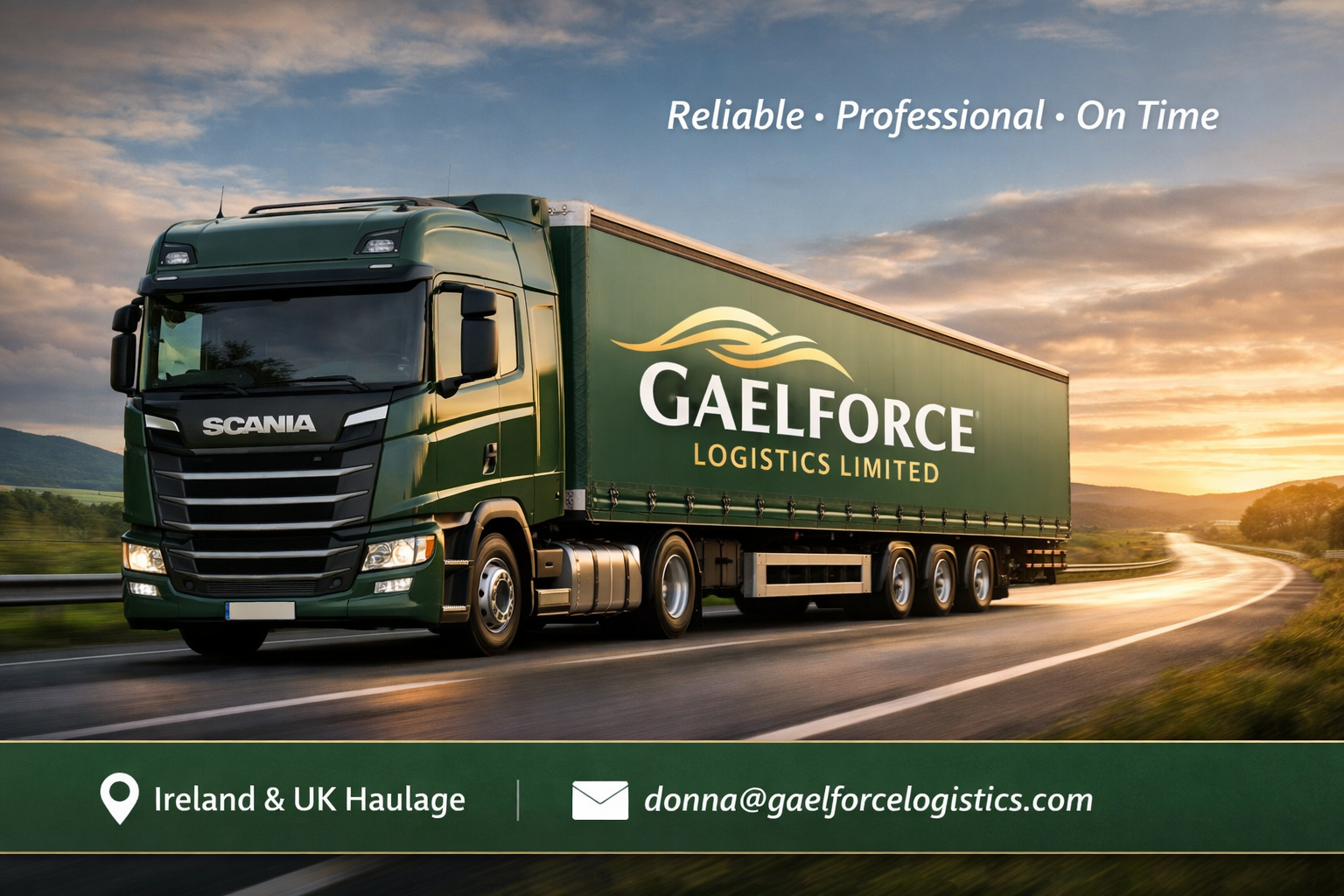 Gaelforce Logistics Limited provides reliable and professional haulage services across Ireland and the UK. We pride ourselves on clear communication, dependable service, and delivering on time — every time.